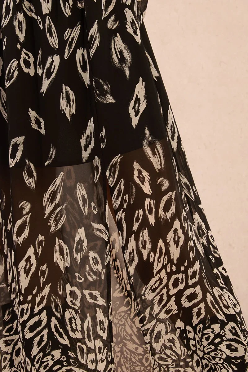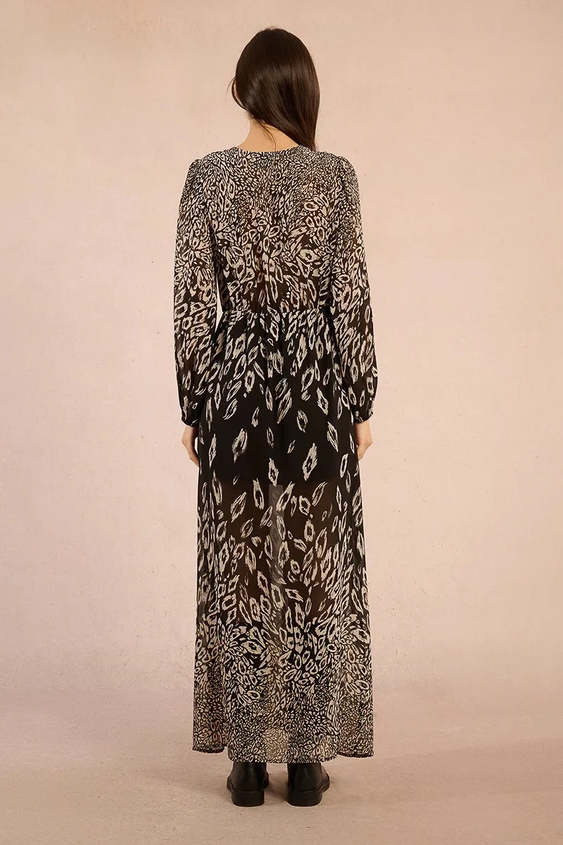 Embrace effortless elegance with this long printed voile dress. Featuring a partially lined design for lightweight comfort, it boasts a wide V-neck and long sleeves with buttoned cuffs for a polished look. The marked and elasticated waist enhances your silhouette, making it a versatile piece perfect for any occasion.