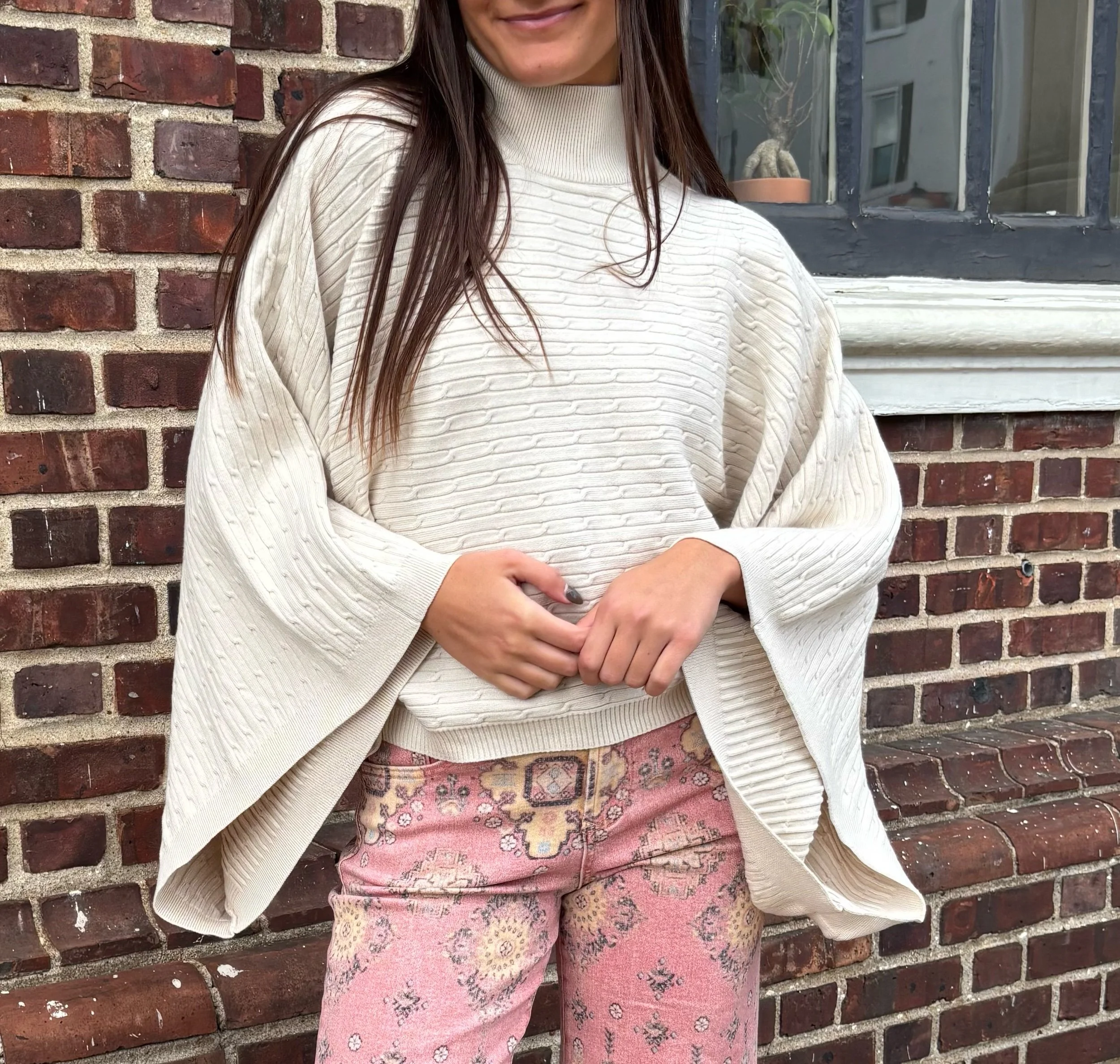 This sweater is your go-to for effortless comfort and style. With its relaxed draped sleeves, soft knit texture, and mock neckline, this piece moves beautifully while keeping you warm.
