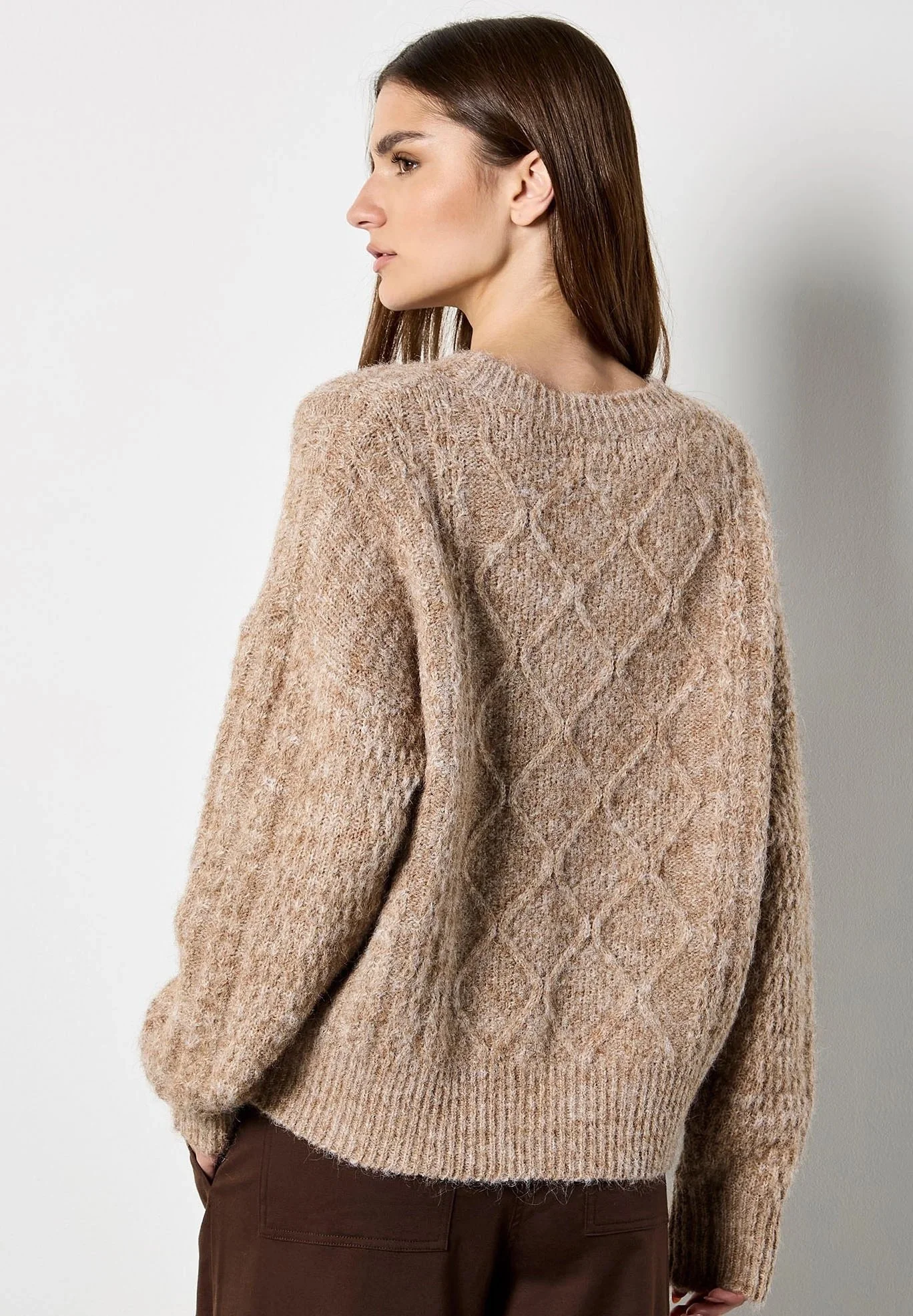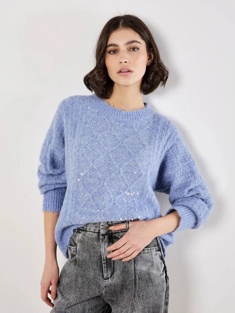 This knitted sweater features long openwork sleeves adorned with a delicate heart pattern, adding a subtle touch of charm. Tightened cuffs provide a secure fit, while the round neckline sits close to the neck for a classic, comfortable look. Designed with a straight fit, this sweater offers a timeless silhouette perfect for layering or wearing on its own.