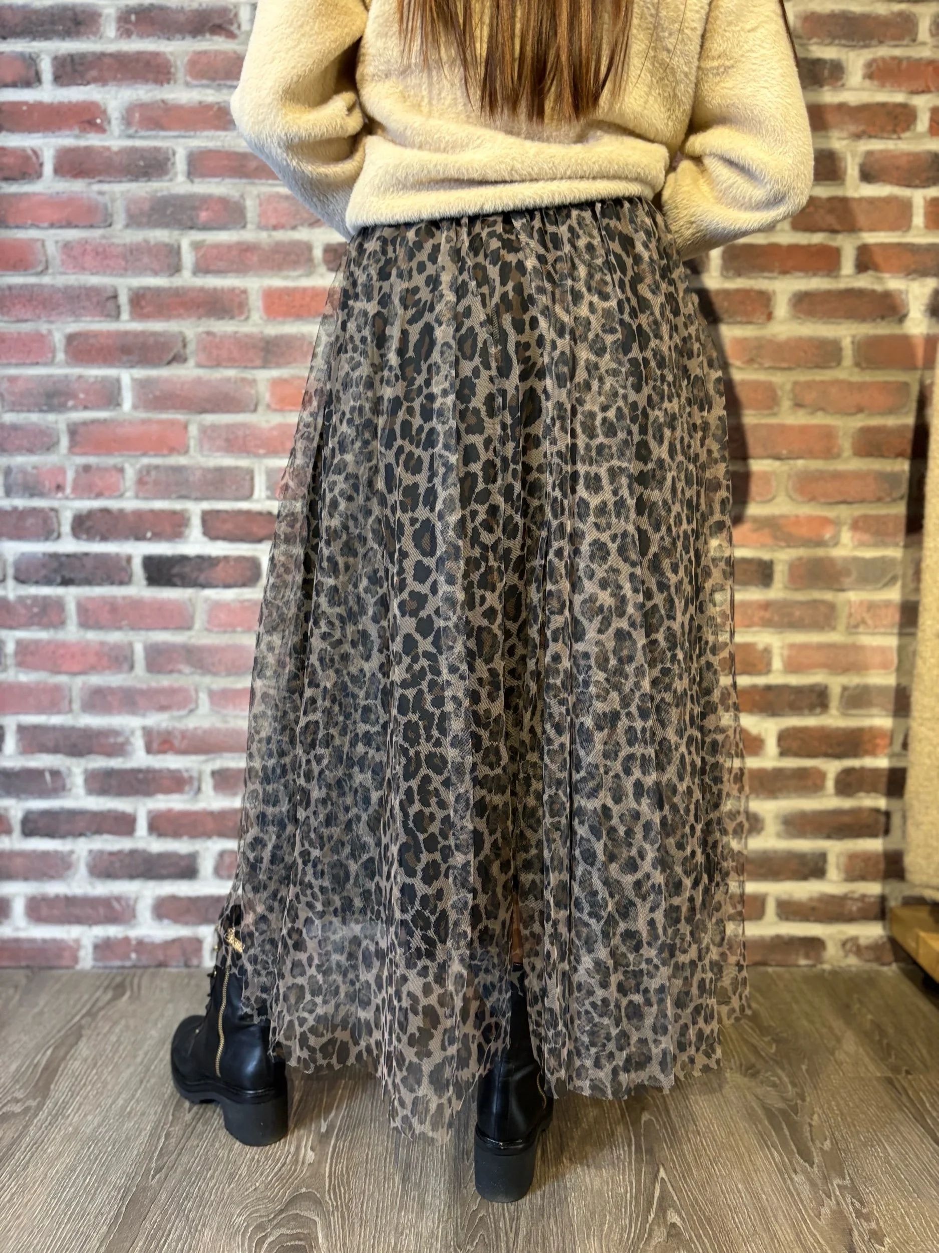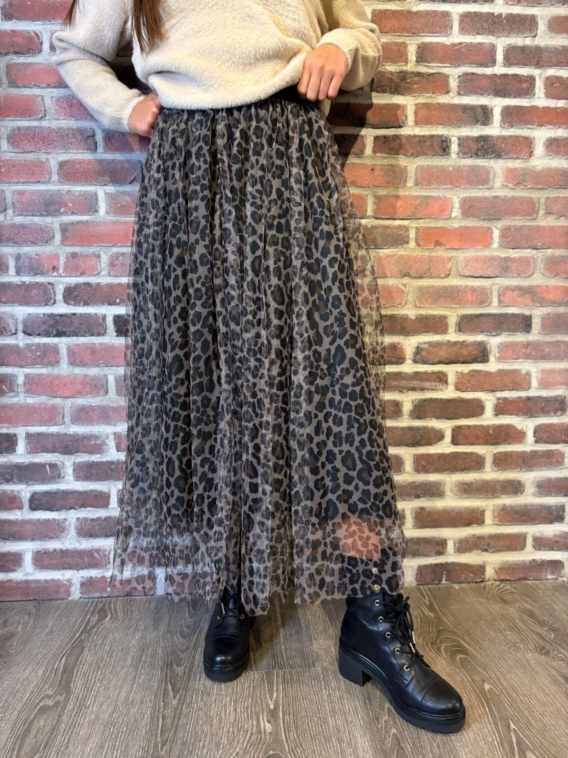 This brown flared skirt features a striking animal print pattern, designed for a regular fit with a comfortable elastic waistband and hem. Made entirely of synthetic materials, the shell and lining are both 100% polyester, ensuring durability and ease of care. Measuring approximately 90cm in length, it has a straight hem and a pullover fastening for a simple, stylish look.