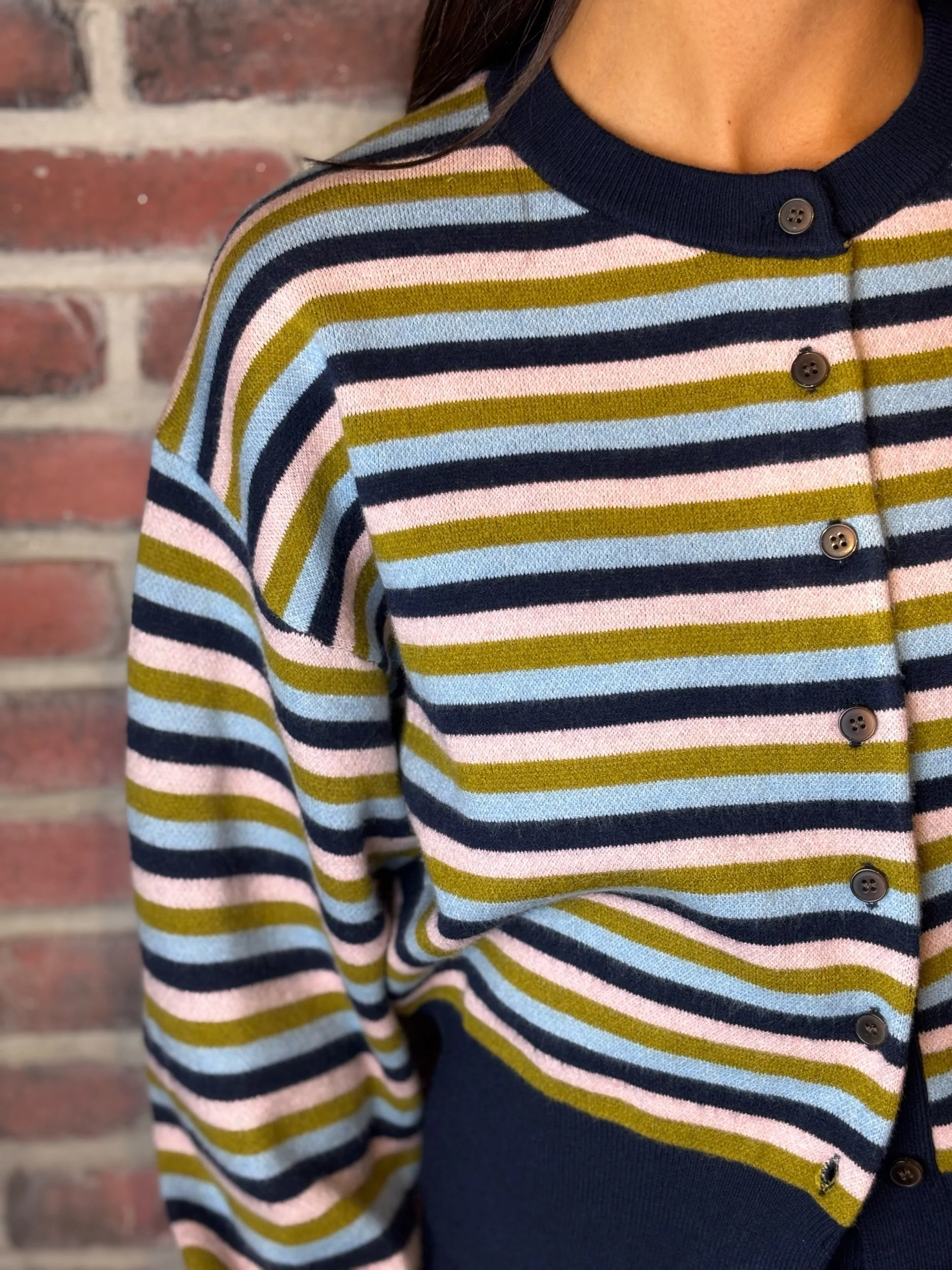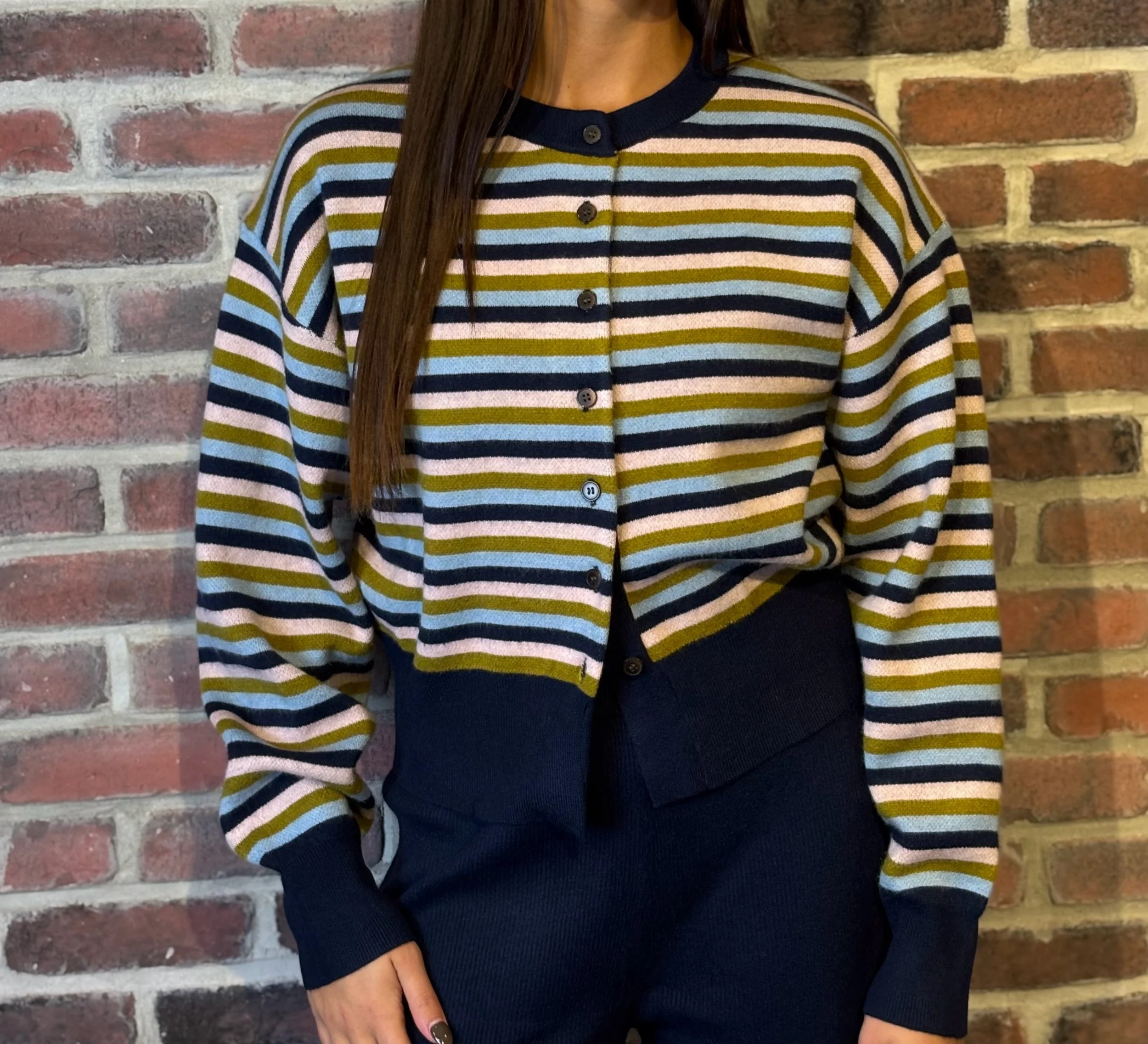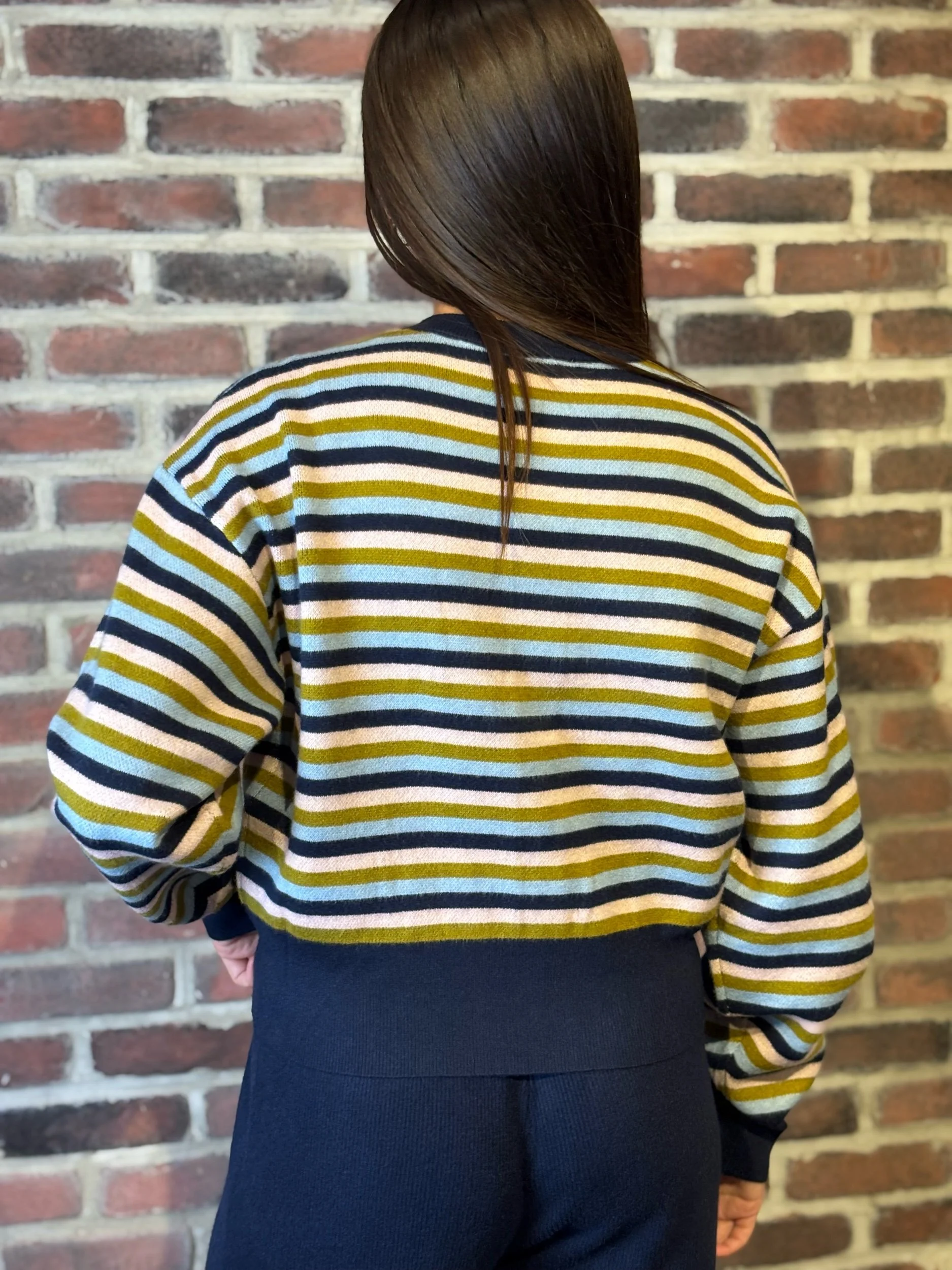 Add a pop of color to your wardrobe with the Sunday Stroll Sweater. This cozy knit features soft pastel and earthy stripes with a relaxed fit that makes it perfect for layering or wearing on its own. The button-up front and navy trim add a classic touch, while the playful stripes make it easy to dress up or down.